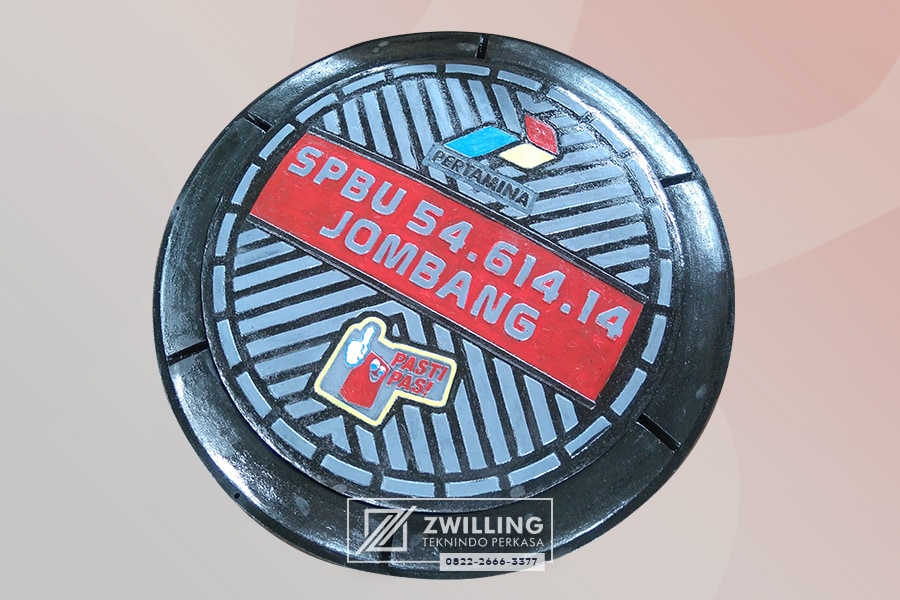 Dari tadi kita membahas desain penutup lubang jalan untuk kabupaten/ kota. Kali mari kita beralih ke salah satu proyek Zwilling untuk BUMN Pertamina. Lebih tepatnya proyek pengadaan manhole untuk lini usaha hilirnya yaitu SPBU. Pada area SPBU tentu yang harus diperhatikan pertama kali adalah fungsionalitas dan kekuatan. Mengapa? Karena di SPBU manhole cover akan menanggung beban lalu lintas truk tangki pertamina. Sehingga kekuatan menjadi prioritas utama dibandingkan manhole yang dipasang di pedestrian. Meski demikian, nilai branding juga harus disematkan pada tutup manhole. Desain manhole cover Pertamina membrandingkan logo sekaligus slogan “Pasti Pas”-nya. Pattern manhole dirancang bergaris agar seimbang dengan flooring SPBU yang berupa paving block.