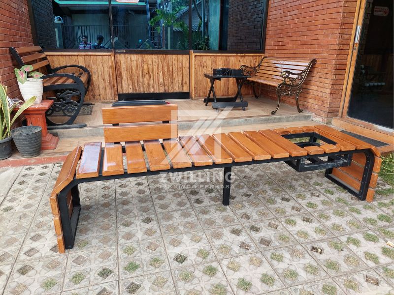 Kombinasi besi dan kayu menciptakan tampilan yang kontras namun harmonis. Rangka besi memberikan kesan modern, sementara dudukan kayu menambah sentuhan hangat dan alami. Desain ini cocok untuk interior bergaya rustic maupun industrial.