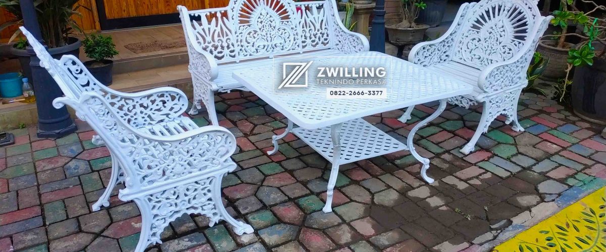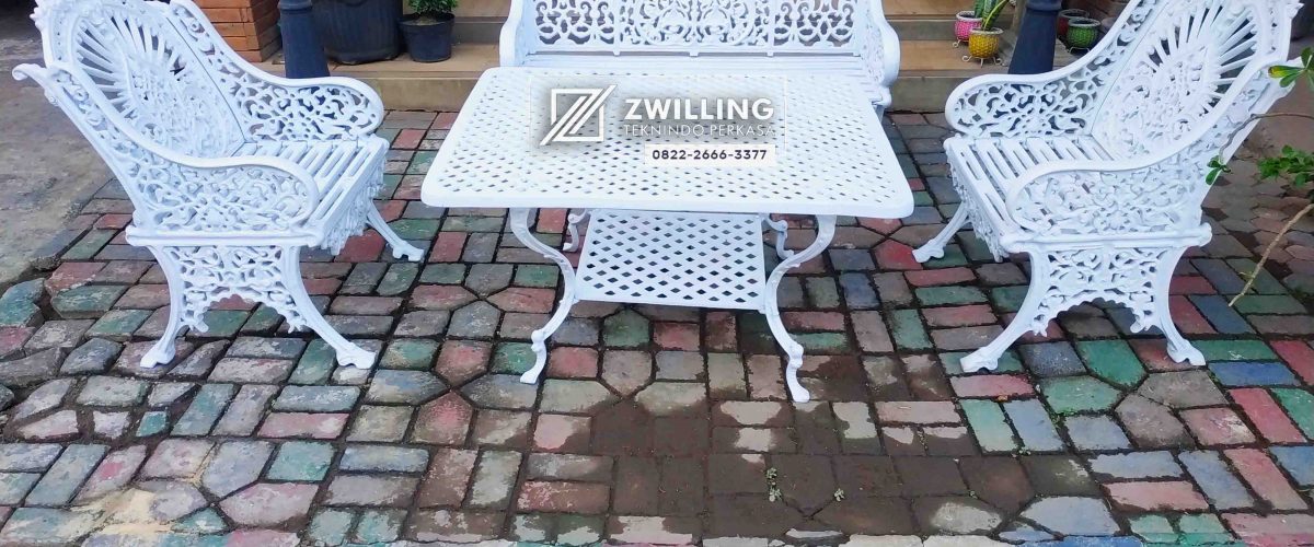 Bahan utama dari meja dan kursi tersebut yaitu full cor logam pilihan, dengan ukuran meja 110 cm (P) x  80 cm (L). Kursi panjang tersebut mempunyai ukuran 120cm (P), dalam pembuatan kursi dan meja ini menggunakan mesin CNC. Hasil ornamen yang didapatkan juga sangat detail dan halus. Bisa disimpulkan bahwa pembuatan kursi dan meja kami menggunakan bahan yang sangat berkualitas.
