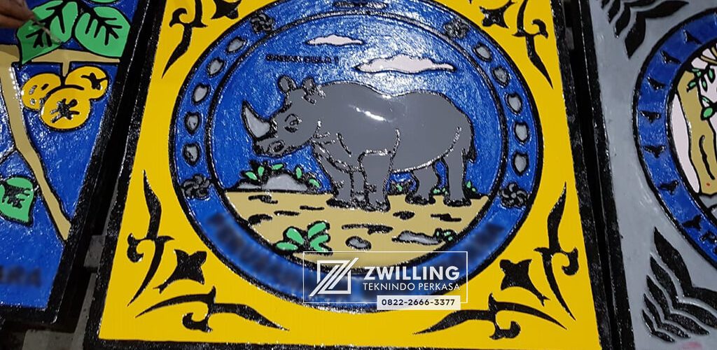 Sesuai dokumentasi foto proyek kami, pada manhole cover cast iron berikut terdapat motif bunga raflessia, badak bercula satu, burung walet, dan pohon jeruk dengan kombinasi warna yang unik. Dari warna hijau, biru, kuning, coklat, maupun warna lainnya terlihat saling melengkapi dan mengisi. Selain itu, motif burung walet yang kami buat juga terkesan mempunyai ciri khas tersendiri. Sehingga kalau dipandang terus-terusan, kita tidak cepat merasa bosan.